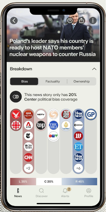 Ground News Ground News is een onafhankelijk mediaplatform dat zich richt op mediawijsheid en het blootleggen van nieuws-bias. In plaats van zelf fact-checks te doen, vergelijkt Ground News hoe eenzelfde nieuwsfeit wordt gebracht door verschillende media, variërend van links tot rechts, nationaal en internationaal. Het platform laat zien welke politieke invals hoek een bron mogelijk heeft, of een verhaal onderbelicht is, en of het grotendeels wordt genegeerd door bepaalde media. Een opvallend kenmerk is de zogeheten ‘Bias Distribution’: een visuele weergave van hoe links-, centrum- en rechtsgeoriënterende nieuwsorganisaties verslag doen van hetzelfde onderwerp. Ook biedt Ground News een functie die laat zien of je als lezer vooral bronnen uit één kamp leest. Het is een hulpmiddel om uit je informatie-bubbel te ontsnappen.
