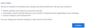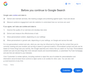 Refusing cookies on Google is arguably even more confusing and tiring for the users. First the user has to choose between ‘agreeing’ to allow all the cookies or ‘customizing’ their choice.