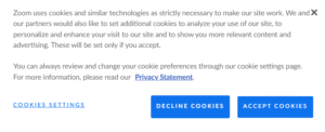 The same happens when we go visit Zoom’s website, users can choose with one click if they want to decline or to accept cookies, before they continue using the website.