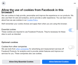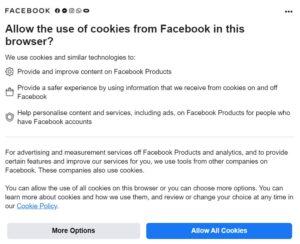 Now let’s look at Facebook. Instantly, the outcome is completely different. The first thing users see is the banner below, which gives them the option to allow all cookies or choose more options.